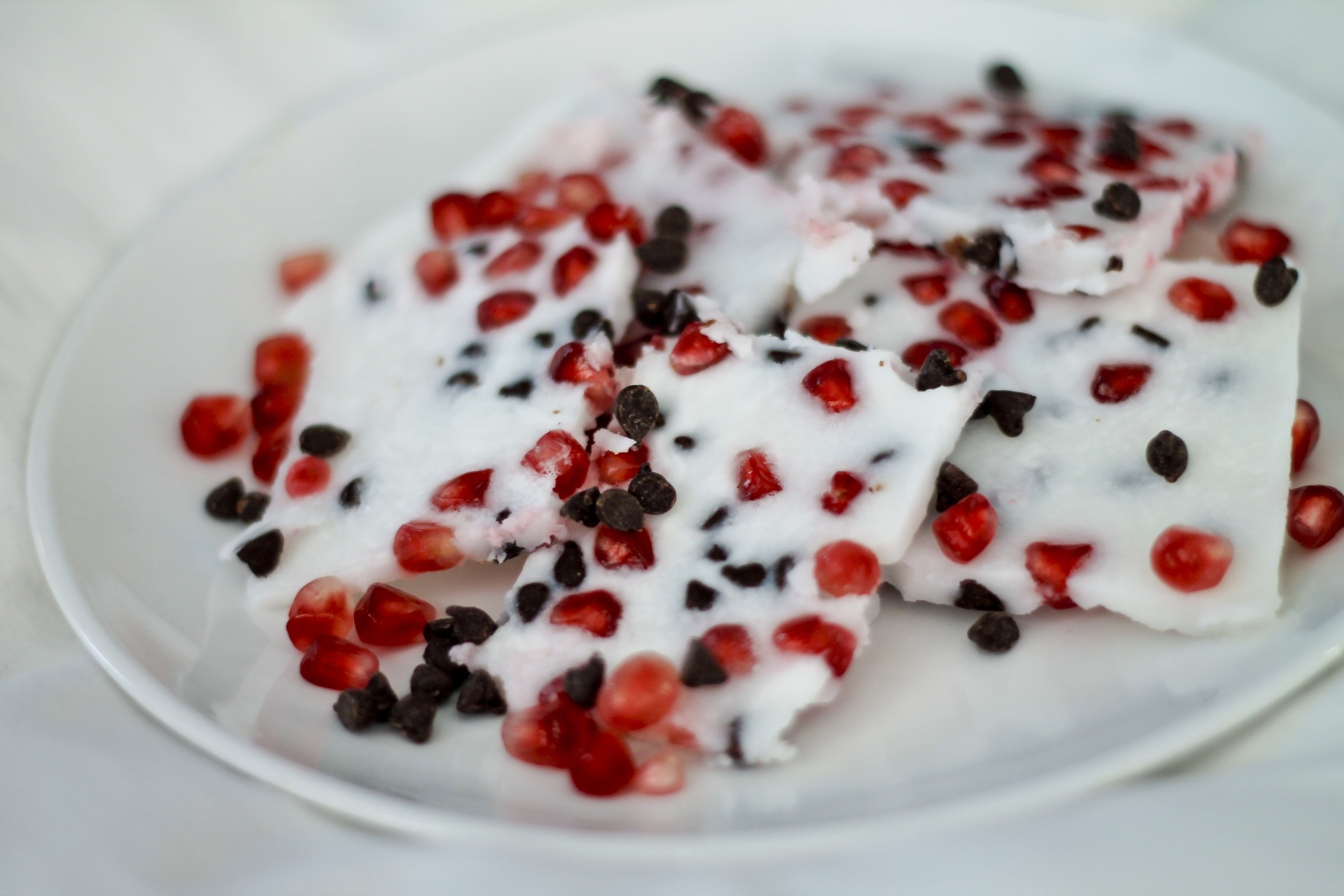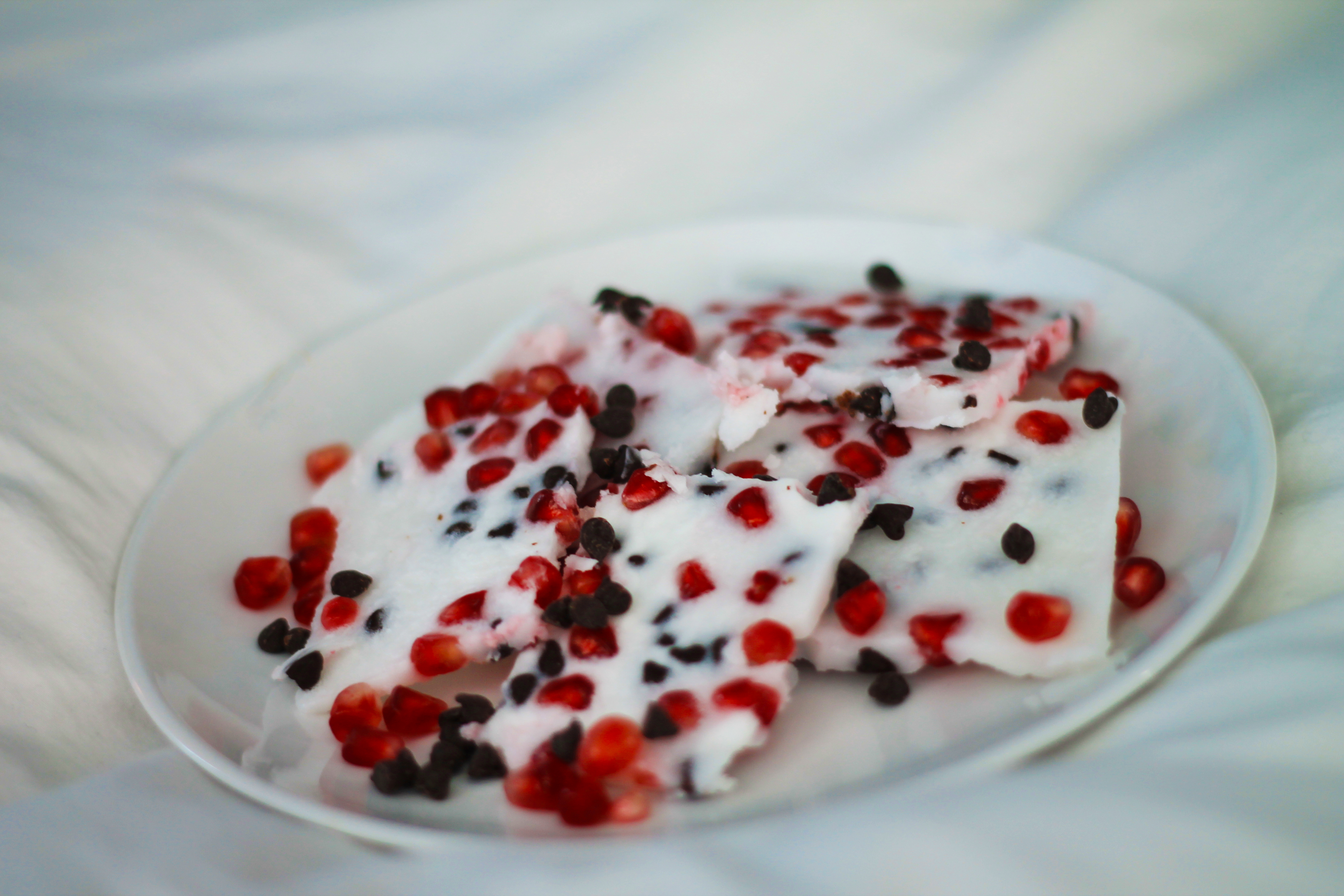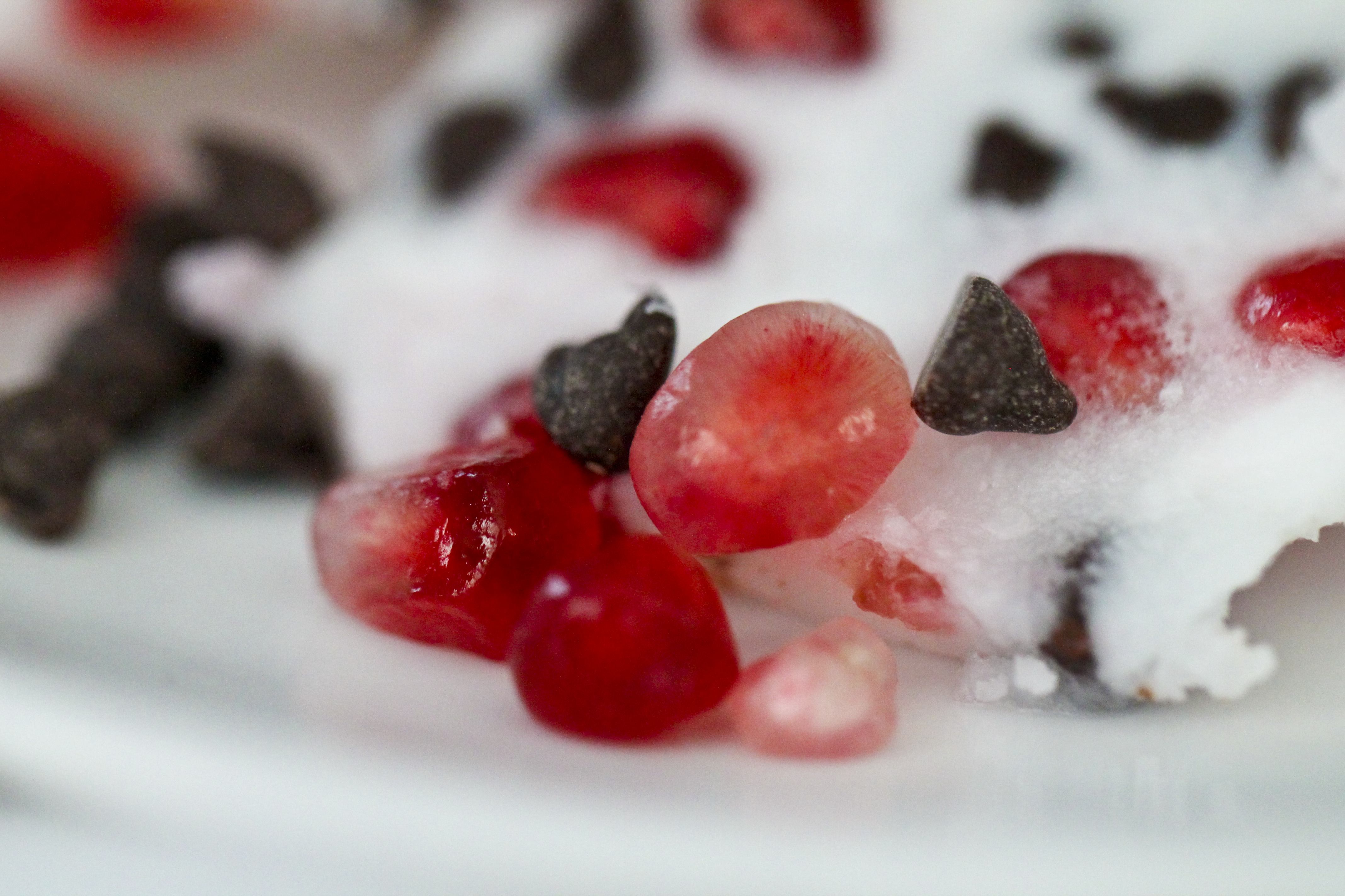 Next, sprinkle pomegranate seeds, candy cane and chocolate chips onto your mixture. Place your baking dish in the freezer for at least 15 minutes.
